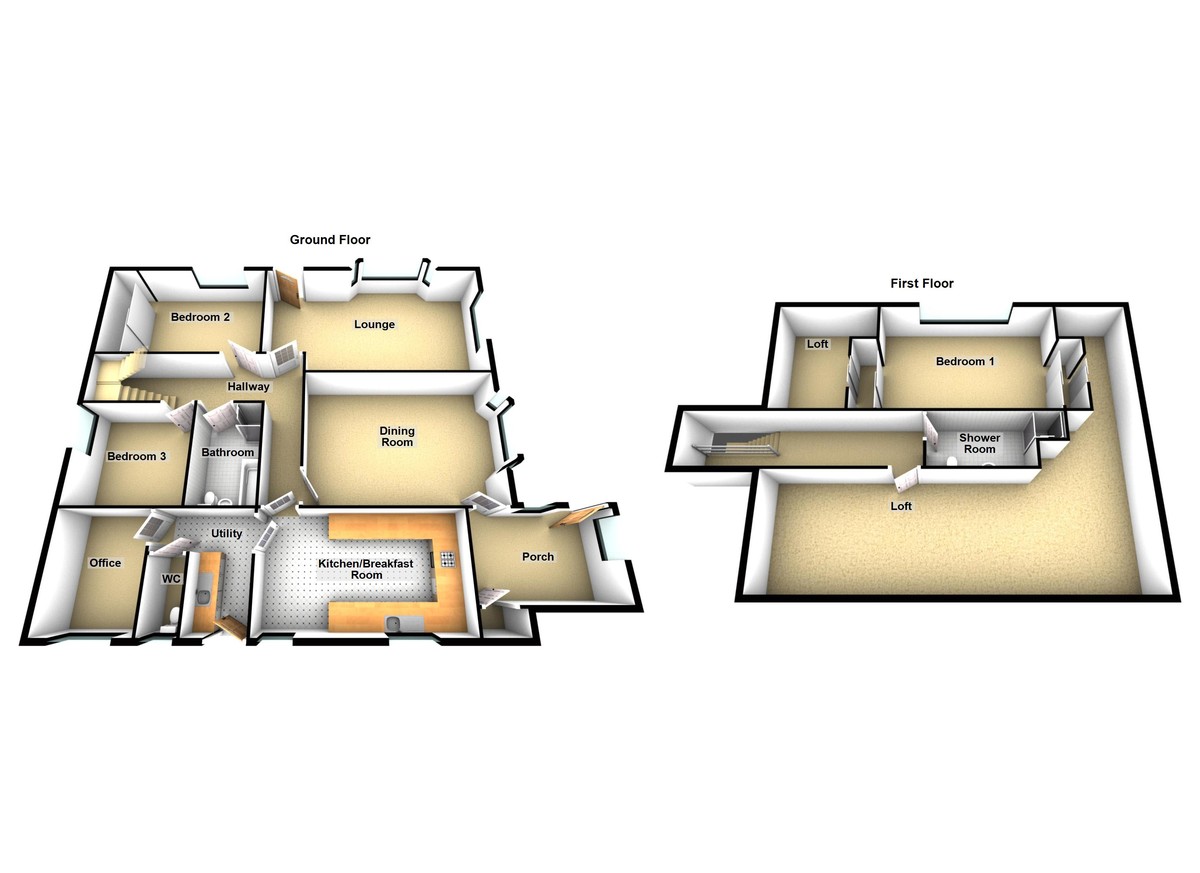 The ground floor offers generous and versatile accommodation. A spacious kitchen and breakfast room forms the heart of the home, while the dining room with bay window provides an elegant setting for entertaining and can equally serve as a library. The bright dual aspect lounge is filled with natural light from its bay window and enjoys breathtaking views towards the Sidlaw Hills. Two further well proportioned bedrooms, one with built in wardrobe, are located on this level alongside a family bathroom with bath and separate shower. An office, WC and utility room add further practicality to the layout.