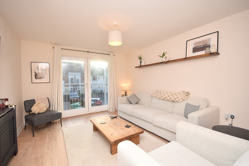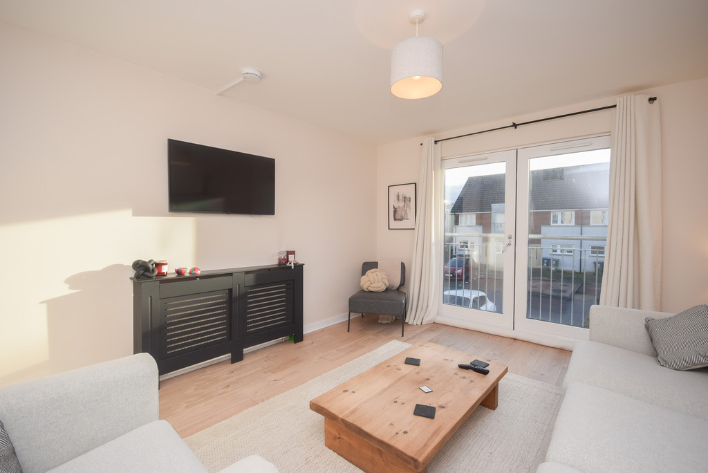 Inside, the layout flows from a welcoming hall into a bright, airy lounge where full-height doors open to a Juliet balcony, pulling in natural light and giving a pleasant outlook over the development. The adjoining kitchen/dining room is smart and well-planned, with modern white cabinetry, ample worktop space, a gas hob and room for a table-ideal for everyday meals or relaxed hosting.